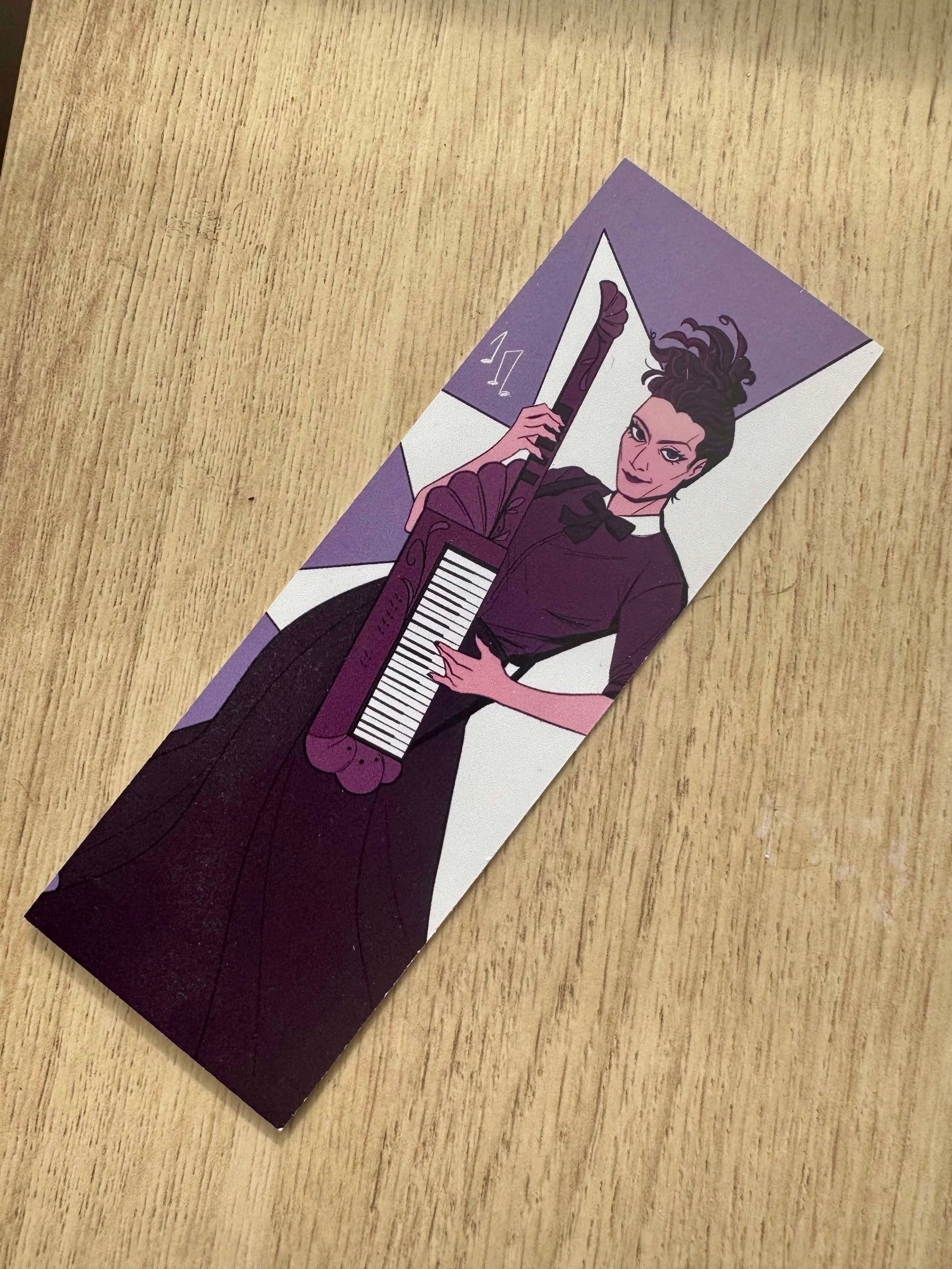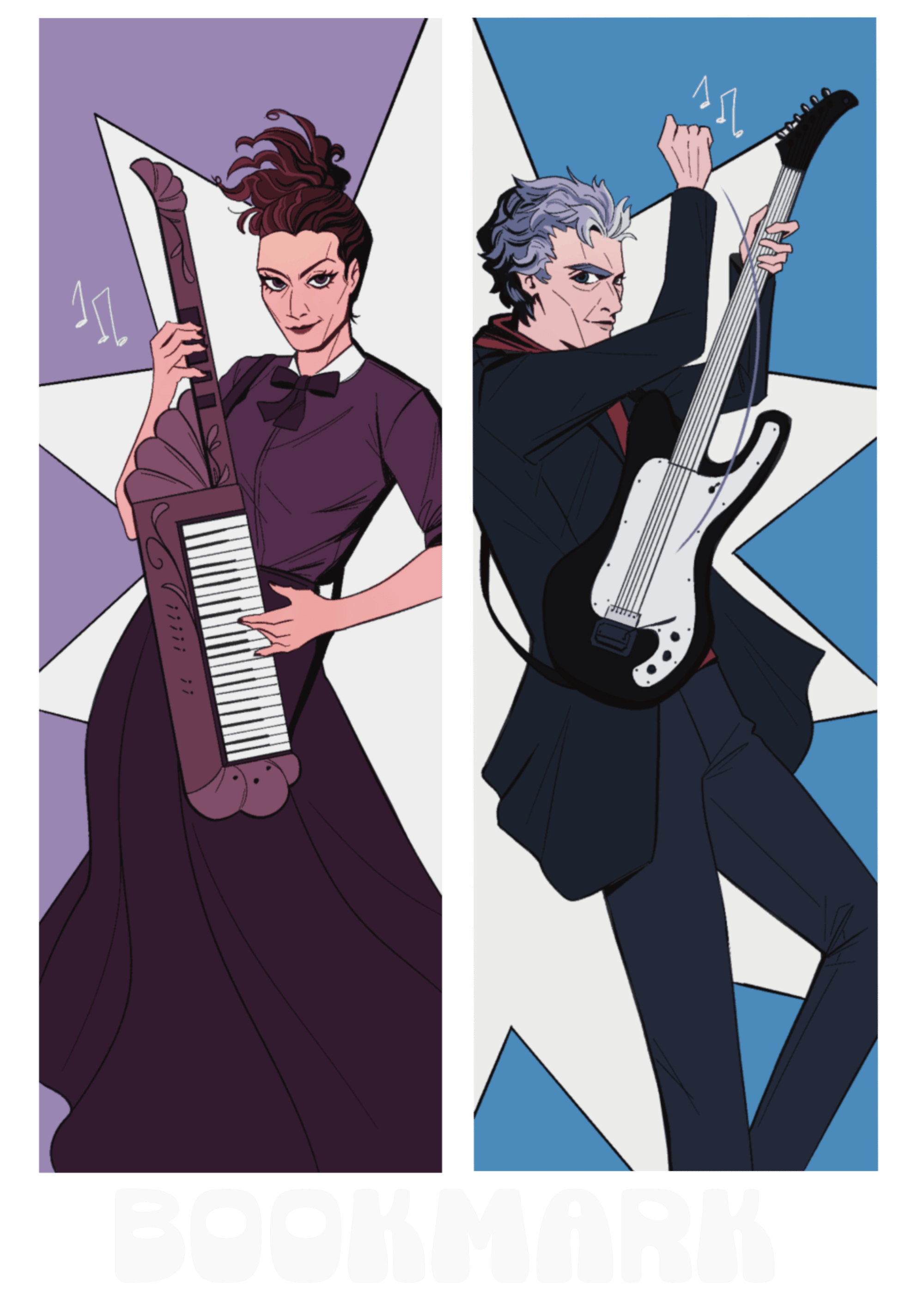 This double sided bookmark was designed by @xxedvigexx, featuring the Twelfth Doctor playing guitar on a blue background, and Missy playing the electronic keyboard on a purple background.